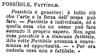 | Fattibile, Possibile - Fattibile accenna alla convenienza del doversi o no fare una cosa: «Ciò che domandi non è fattibile;» o accenna alla attitudine dell'operante e alle sue forze. - Possibile ha significazione più generica e più larga; ciò che non è possibile non è fattibile ad alcuno. Molte cose sono fattibili a molti, non sono a tutti possibili. [immagine] |