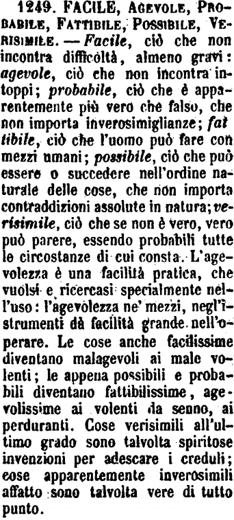 | Facile, Agevole, Probabile, Fattibile, Possibile, Verisimile - Facile, ciò che non incontra difficoltà, almeno gravi: agevole, ciò che non incontra intoppi; probabile, ciò che è apparentemente più vero che falso, che non importa inverosimiglianze; fattibile, ciò che l'uomo può fare con mezzi umani; possibile, ciò che può essere o succedere nell'ordine naturale delle cose, che non importa contraddizioni assolute in natura; verisimile, ciò che se non è vero, vero può parere, essendo probabili tutte le circostanze di cui consta. L'agevolezza è una facilità pratica, che vuolsi e ricercasi specialmente nell'uso: l'agevolezza ne' mezzi, negl'istrumenti dà facilità grande nell'operare. Le cose anche facilissime diventano malagevoli ai male volenti; le appena possibili e probabili diventano fattibilissime, agevolissime ai volenti da senno, ai perduranti. Cose verisimili all'ultimo grado sono talvolta spiritose invenzioni per adescare i creduli; cose apparentemente inverosimili affatto sono talvolta vere di tutto punto. [immagine] |