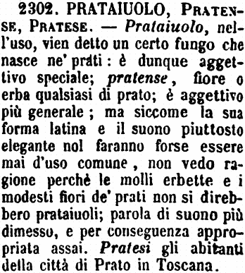 | Prataiuolo, Pratense, Pratese - Prataiuolo, nell'uso, vien detto un certo fungo che nasce ne' prati: è dunque aggettivo speciale; pratense, fiore o erba qualsiasi di prato; è aggettivo più generale; ma siccome la sua forma latina e il suono piuttosto elegante nol faranno forse essere mai d'uso comune, non vedo ragione perchè le molli erbette e i modesti fiori de' prati non si direbbero prataiuoli; parola di suono più dimesso, e per conseguenza appropriata assai. Pratesi gli abitanti della città di Prato in Toscana. [immagine] |