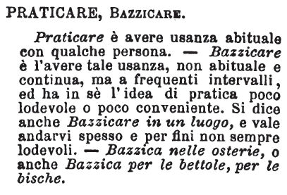 | Praticare, Bazzicare - Praticare è avere usanza abituale con qualche persona. - Bazzicare è l'avere tale usanza, non abituale e continua, ma a frequenti intervalli, ed ha in sè l'idea di pratica poco lodevole o poco conveniente. Si dice anche Bazzicare in un luogo, e vale andarvi spesso e per fini non sempre lodevoli. Bazzica nelle osterie, o anche Bazzica per le bettole, per le bische. [immagine] |