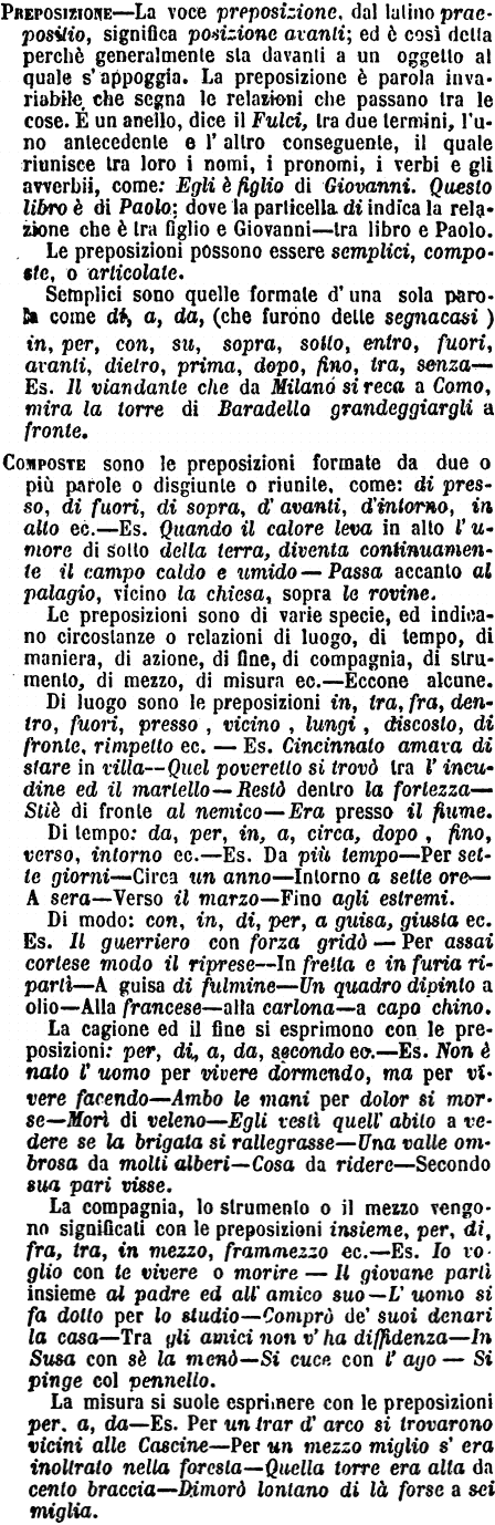 | Preposizione - La voce preposizione, dal latino praepositio, significa posizione avanti; ed è così detta perchè generalmente sta davanti a un oggetto al quale s’appoggia. La preposizione è parola invariabile che segna le relazioni che passano tra le cose. È un anello, dice il Fulci, tra due termini, l’uno antecedente e l’altro conseguente, il quale riunisce tra loro i nomi, i pronomi, i verbi e gli avverbii, come: Egli è figlio di Giovanni. Questo libro è di Paolo; dove la particella di indica la relazione che è tra figlio e Giovanni – tra libro e Paolo.