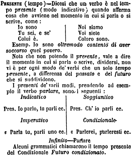 Io sono Tu sei, e se' Colui è. Noi siamo Voi siete Coloro sono. Esemp. Io sono oltremodo contento di aver soccorso quel povero. Nota che non potendo il presente, vale a dire il momento in cui si parla o scrive, dividersi, non vi è per ogni modo de' verbi che un solo tempo presente, a differenza del passato e del futuro che si suddividono. I presenti de' varii modi, prendendo ad esempio il verbo parlare, sono i seguenti: Indicativo Pres. Io parlo, tu parli ec. Imperativo «Parla tu, parli uno ec. Soggiuntivo Pres. Ch'io parli ec. Condizionale «Parlerei, parleresti ec. Infinito - Parlare Alcuni grammatici chiamarono il tempo presente del Condizionale Futuro condizionato. [immagine] |