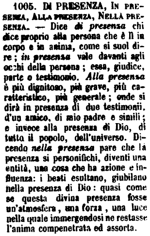| Di presenza, In presenza, Alla presenza, Nella presenza - Dice di presenza chi dice proprio alla persona che è lì in corpo e in anima, come si suol dire; in presenza vale davanti agli occhi della persona; essa, giudice, parte o testimonio. Alla presenza è più dignitoso, più grave, più caratteristico, più generale; onde si dirà in presenza di due testimonii, d'un amico, di mio padre e simili; e invece alla presenza di Dio, di tutto il popolo, dell'universo. Dicendo nella presenza pare che la presenza si personifichi, diventi una entità, una cosa che ha azione e influenza: i beati esultano, giubilano nella presenza di Dio: quasi come se questa divina presenza fosse un'atmosfera, una forza, una luce nella quale immergendosi ne restasse l'anima compenetrata ed assorta. [immagine] |