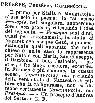 | Presepe, Presepio, Capannuccia - Il primo per Stalla o Mangiatoja, s'usa solo in poesia: in tal senso Presepio, nel singolare, suonerebbe forse men proprio, ridestando l'idea del seguente. - Presepio suol dirsi, quasi per antonomasia, la stalla di Nazaret ove nacque Gesù, e più specialmente quell'apparato che nelle chiese o nelle case lo rappresenta per Natale con Maria, San Giuseppe, il Bambino, il bue, l'asinello, i pastori, i Re Magi, eccetera, eccetera. In Firenze è più comune, in questo senso, Capannuccia; ma parlando della vera stalla di Nazaret o di pittura che la raffigurasse, non si direbbe certamente Capannuccia, ma Presepio. - «Un presepio d'Andrea del Sarto.» G. F. [immagine] |