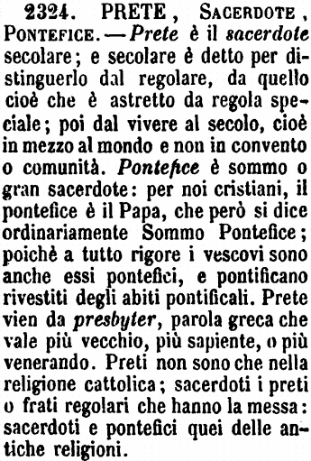 | Prete, Sacerdote, Pontefice - Prete è il sacerdote secolare; e secolare è detto per distinguerlo dal regolare, da quello cioè che è astretto da regola speciale; poi dal vivere al secolo, cioè in mezzo al mondo e non in convento o comunità. Pontefice è sommo o gran sacerdote: per noi cristiani, il pontefice è il Papa, che però si dice ordinariamente Sommo Pontefice; poichè a tutto rigore i vescovi sono anche essi pontefici, e pontificano rivestiti degli abiti pontificali. Prete vien da presbyter, parola greca che vale più vecchio, più sapiente, o più venerando. Preti non sono che nella religione cattolica; sacerdoti i preti o frati regolari che hanno la messa: sacerdoti e pontefici quei delle antiche religioni. [immagine] |