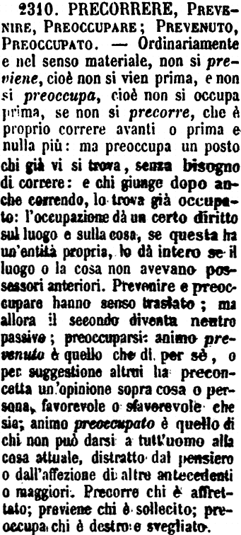 | Precorrere, Prevenire, Preoccupare; Prevenuto, Preoccupato - Ordinariamente e nel senso materiale, non si previene, cioè non si vien prima, e non si preoccupa, cioè non si occupa prima, se non si precorre, che è proprio correre avanti o prima e nulla più: ma preoccupa un posto chi già vi si trova, senza bisogno di correre: e chi giunge dopo anche correndo, lo trova già occupato: l'occupazione dà un certo diritto sul luogo e sulla cosa, se questa ha un'entità propria, lo dà intero se il luogo o la cosa non avevano possessori anteriori. Prevenire e preoccupare hanno senso traslato; ma allora il secondo diventa neutro passivo; preoccuparsi: animo prevenuto è quello che di per sé, o per suggestione altrui ha preconcetta un'opinione sopra cosa o persona, favorevole o sfavorevole che sia; animo preoccupato è quello di chi non può darsi a tutt'uomo alla cosa attuale, distratto dal pensiero o dall'affezione di altre antecedenti o maggiori. Precorre chi è affrettato; previene chi è sollecito; preoccupa chi è destro e svegliato. [immagine] |