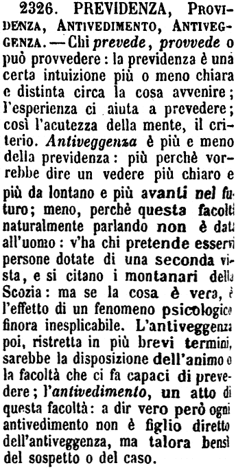 | Previdenza, Providenza, Antivedimento, Antiveggenza - Chi prevede, provvede o può provvedere: la previdenza è una certa intuizione più o meno chiara e distinta circa la cosa avvenire; l'esperienza ci aiuta a prevedere; così l'acutezza della mente, il criterio. Antiveggenza è più e meno della previdenza: più perchè vorrebbe dire un vedere più chiaro e più da lontano e più avanti nel futuro; meno, perchè questa facoltà naturalmente parlando non è data all'uomo: v'ha chi pretende esservi persone dotate di una seconda vista, e si citano i montanari della Scozia: ma se la cosa è vera, è l'effetto di un fenomeno psicologico finora inesplicabile. L'antiveggenza poi, ristretta in più brevi termini, sarebbe la disposizione dell'animo o la facoltà che ci fa capaci di prevedere; l'antivedimento, un atto di questa facoltà: a dir vero però ogni antivedimento non è figlio diretto dell'antiveggenza, ma talora bensì del sospetto o del caso. [immagine] |