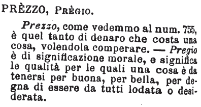 | Prezzo, Pregio - Prezzo, come vedemmo al num. 755, è quel tanto di denaro che costa una cosa, volendola comperare. - Pregio è di significazione morale, e significa le qualità per le quali una cosa è da tenersi per buona, per bella, per degna di essere da tutti lodata o desiderata. [immagine] |