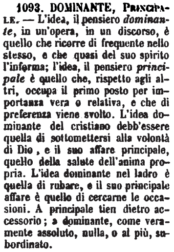 | Dominante, Principale - L'idea, il pensiero dominante, in un'opera, in un discorso, è quello che ricorre frequente nello stesso, e che quasi del suo spirito l'informa; l'idea, il pensiero principale è quello che, rispetto agli altri, occupa il primo posto per importanza vera o relativa, e che di preferenza viene svolto. L'idea dominante del cristiano debb'essere quella di sottomettersi alla volontà di Dio, e il suo affare principale, quello della salute dell'anima propria. L'idea dominante nel ladro è quella di rubare, e il suo principale affare è quello di cercarne le occasioni. A principale tien dietro accessorio; a dominante, come veramente assoluto, nulla, o al più, subordinato. [immagine] |
