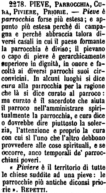 | Pieve, Parrocchia, Cura, Piviere, Priorie - Pieve è parrocchia forse più estesa; e appunto più estesa perchè di campagna e perchè abbraccia talora diversi casali in cui il paese formante la parrocchia è diviso; il pievano o capo di pieve è gerarchicamente superiore in dignità, in onore e facoltà ai diversi parrochi suoi circonvicini. In alcuni luoghi si dice cura alla parrocchia per la ragione che là si dice curato al parroco: ma curato è il sacerdote che aiuta il parroco nell'amministrare spiritualmente la parrocchia, e cura dice o dovrebbe dire piuttosto la solerzia, l'attenzione e proprio la cura con cui sì l'uno che l'altro debbono provvedere alle cose spirituali, e se occorre, anco temporali de' parrocchiani poveri.