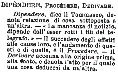 | Dipendere, Procedere, Derivare - Dipendere, dice il Tommaseo, denota relazione di cosa sottoposta a un'altra. - «La mancanza di notizie, dipende dall'esser rotti i fili del telegrafo.» - Il succedere degli effetti alle cause loro, e l'andamento di questi e di quelle, è il Procedere. - Il Derivare accenna alla origine prima, alla fonte, e denota l'atto per il quale una cosa deducesi da un'altra. [immagine] |