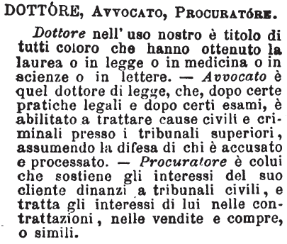 | Dottore, Avvocato, Procuratore - Dottore nell'uso nostro è titolo di tutti coloro che hanno ottenuto la laurea o in legge o in medicina o in scienze o in lettere. - Avvocato è quel dottore di legge, che, dopo certe pratiche legali e dopo certi esami, è abilitato a trattare cause civili e criminali presso i tribunali superiori, assumendo la difesa di chi è accusato e processato. - Procuratore è colui che sostiene gli interessi del suo cliente dinanzi a tribunali civili, e tratta gli interessi di lui nelle contrattazioni, nelle vendite e compre, o simili. [immagine] |