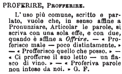 | Proferire, Profferire - L'uso più comune, scritto e parlato, vuole che, in senso affine a Pronunziare, Articolar le parole, si scriva con una sola effe, e con due, quando è affine a Offrire. - «Proferisce male - poco distintamente.» - «Profferisco quello che posso.» - «Ci profferse il suo letto - un fiasco di vino.» - «Proferiva parole non intese da noi.» G. F. [immagine] |