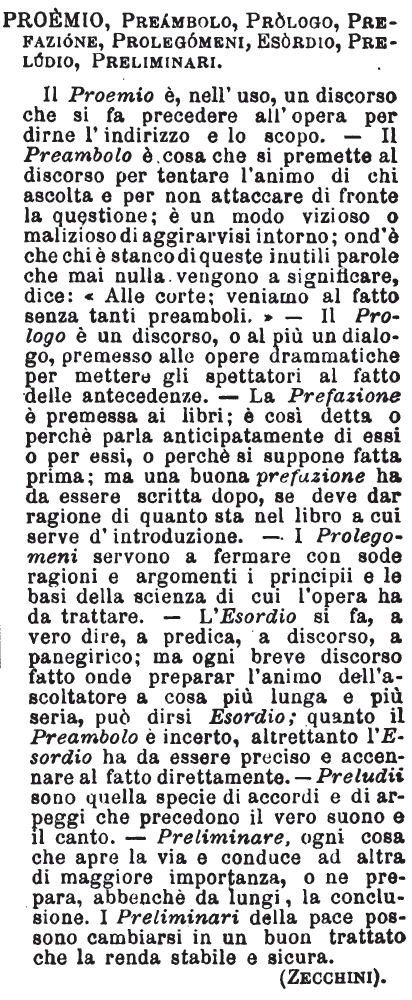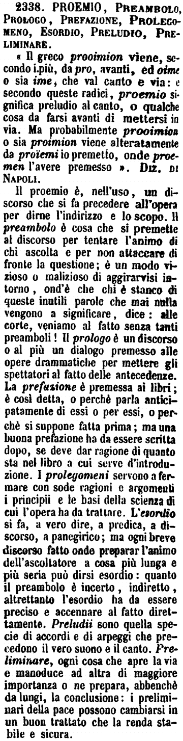 | Proemio, Preambolo, Prologo, Prefazione, Prolegomeno, Esordio, Preludio, Preliminare - «Il greco prooimion viene, secondo i più, da pro, avanti, ed oime o sia ime, che val canto e via: e secondo queste radici, proemio significa preludio al canto, o qualche cosa da farsi avanti di mettersi in via. Ma probabilmente prooimion o sia proimion viene alteratamente da proïemi io premetto, onde proemen l'avere premesso». Diz. di Napoli.