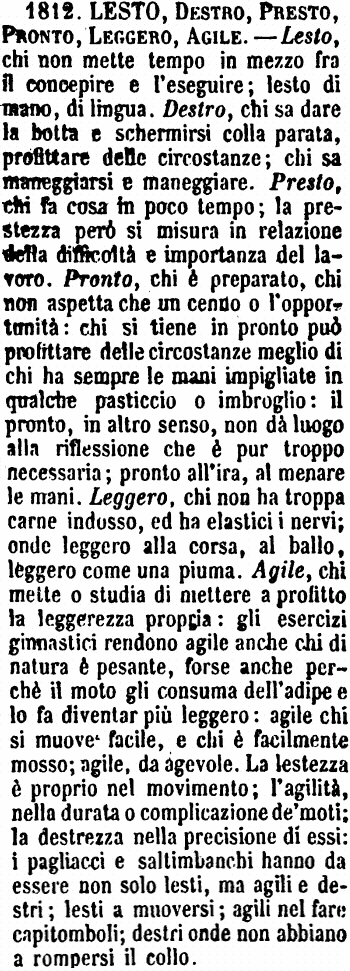 | Lesto, Destro, Presto, Pronto, Leggiero, Agile - Lesto, chi non mette tempo in mezzo fra il concepire e l'eseguire; lesto di mano, di lingua. - Destro, chi sa dare la botta e schermirsi colla parata, profittare delle circostanze; chi sa maneggiarsi e maneggiare. - Presto, chi fa cose in poco tempo: la prestezza però si misura in relazione della difficoltà e importanza del lavoro. - Pronto, chi è preparato, chi non aspetta che un cenno o l'opportunità: chi si tiene in pronto può profittare delle circostanze meglio di chi ha sempre le mani impigliate in qualche pasticcio o imbroglio: il pronto, in altro senso, non dà luogo alla riflessione che è pur troppo necessaria; pronto all'ira, al menare le mani. - Leggiero, chi non ha troppa carne indosso, ed ha elastici i nervi; onde Leggiero alla corsa, al ballo; Leggiero come una piuma. - Agile, chi mette o studia di mettere a profitto la leggerezza propria. Gli esercizii ginnastici rendono agile anche chi di natura è pesante, forse anche perchè il moto gli consuma dell'adipe e lo fa diventar più leggiero: agile, chi si muove facile, e chi è facilmente mosso; Agile, da Agevole. La lestezza è proprio nel movimento; l'agilità, nella durata o complicazione de' moti; la destrezza nella precisione di essi: i pagliacci e i saltimbanchi hanno da essere non solo lesti, ma agili e destri; lesti a muoversi, agili nel fare capitomboli, destri onde non abbiamo a rompersi il collo. (Zecchini). [immagine] |