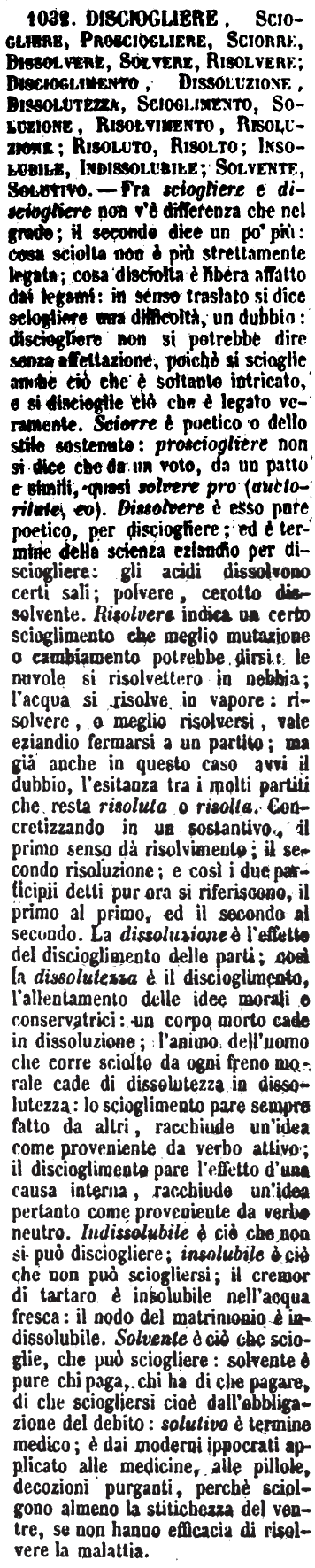 Disciogliere, Sciogliere, Prosciogliere, Sciorre, Dissolvere, Solvere, Risolvere; Discioglimento, Dissoluzione, Dissolutezza, Scioglimento, Soluzione, Risolvimento, Risoluzione; Risoluto, Risolto; Insolubile, Indissolubile; Solvente, Solutivo - Fra sciogliere e disciogliere non v'è differenza che nel grado; il secondo dice un po' più: cosa sciolta non è più strettamente legata; cosa disciolta è libera affatto dai legami: in senso traslato si dice sciogliere una difficoltà, un dubbio: disciogliere non si potrebbe dire senza affettazione, poichè si scioglie anche ciò che è soltanto intricato, e si discioglie ciò che è legato veramente. Sciorre è poetico o dello stile sostenuto: prosciogliere non si dice che da un voto, da un patto e simili, quasi solvere pro (auctoritate, eo). Dissolvere è esso pure poetico, per disciogliere; ed è termine della scienza eziandio per disciogliere: gli acidi dissolvono certi sali; polvere, cerotto dissolvente. Risolvere indica un certo scioglimento che meglio mutazione o cambiamento potrebbe dirsi: le nuvole si risolvettero in nebbia; l'acqua si risolve in vapore: risolvere, o meglio risolversi, vale eziandio fermarsi a un partito; ma già anche in questo caso avvi il dubbio, l'esitanza tra i molti partiti che resta risoluta o risolta. Concretizzando in un sostantivo, il primo senso dà risolvimento; il secondo risoluzione; e così i due participii detti pur ora si riferiscono, il primo al primo, ed il secondo al secondo. La dissoluzione è l'effetto del discioglimento delle parti; così la dissolutezza è il discioglimento, l'allentamento delle idee morali e conservatrici: un corpo morto cade in dissoluzione; l'animo dell'uomo che corre sciolto da ogni freno morale cade di dissolutezza in dissolutezza: lo scioglimento pare sempre fatto da altri, racchiude un'idea come proveniente da verbo attivo; il discioglimento pare l'effetto d'una causa interna, racchiude un'idea pertanto come proveniente da verbo neutro. Indissolubile è ciò che non si può disciogliere; insolubile è ciò che non può sciogliersi; il cremor di tartaro è insolubile nell'acqua fresca: il nodo del matrimonio è indissolubile. Solvente è ciò che scioglie, che può sciogliere: solvente è pure chi paga, chi ha di che pagare, di che sciogliersi cioè dall'obbligazione del debito: solutivo è termine medico; è dai moderni ippocrati applicato alle medicine, alle pillole, decozioni purganti, perché sciolgono almeno la stitichezza del ventre, se non hanno efficacia di risolvere la malattia. [immagine]