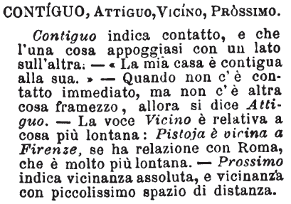 | Contiguo, Attiguo, Vicino, Prossimo - Contiguo indica contatto, e che l'una cosa appoggiasi con un lato sull'altra. - « La mia casa è contigua alla sua. » - Quando non c'è contatto immediato, ma non c'è altra cosa framezzo, allora si dice Attiguo. - La voce Vicino è relativa a cosa più lontana: Pistoja è vicina a Firenze, se ha relazione con Roma, che è molto più lontana. - Prossimo indica vicinanza assoluta, e vicinanza con piccolissimo spazio di distanza. [immagine] |
