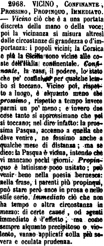 | Vicino, Confinante, Prossimo, Propinquo, Immediato - Vicino ciò che è a una portata discreta della mano o della voce; poi la vicinanza si misura altresì dalle circostanze di grandezza o d'importanza: i popoli vicini; la Corsica e più la Sicilia sono vicine alle coste dell'Italia continentale. Confinante, la casa, il podere, lo stato che pe' confini per qualche lembo si toccano. Vicino poi, rispetto a luogo, è alquanto meno che prossimo, rispetto a tempo invece parmi un po' meno; e invero due cose tanto si approssimano che poi si toccano; nel dire infatto: la prossima Pasqua, accenno a quella che deve venire, ne fossimo anche a qualche mese di distanza; ma se dico: la Pasqua è vicina, intendo che vi mancano pochi giorni. Propinquo è latinismo poco usitato; può venir bene nella poesia bernesca: nella frase, i parenti più propinqui, può stare però anco in prosa e nello stile serio. Immediato ciò che non ha tempo o altra circostanza in mezzo: di certe cause, od agenti immediato è l'effetto, ma come sempre alquanto precipitoso o violento, vanno applicati colla più severa e oculata prudenza. [immagine] |