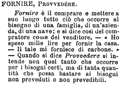 | Fornire, Provvedere - Fornire è il comprare e mettere a suo luogo tutto ciò che occorre al bisogno di una famiglia, di un'azienda, di una nave; e si dice così del compratore come del venditore, - « Ho speso mille lire per fornir la casa. - Il tale mi fornisce di carbone.» - Quando si dice Provvedere si intende non quel tanto che occorre per i bisogni certi, ma di tanta quantità che possa bastare ai bisogni non preveduti o non prevedibili. [immagine] |