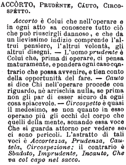 | Accorto, Prudente, Cauto, Circospetto - Accorto è Colui che nell'operare e in ogni atto sa conoscere tutto ciò che può riuscirgli dannoso, e che da un lievissimo indizio comprende l'atrui pensiero, l'altrui volontà, gli altrui disegni. - L'uomo prudente è Colui che, prima di operare, ci pensa maturamente, e pondera ogni caso contrario che possa avvenire, e tien conto della opportunità del fare. - Cauto si dice Chi nell'operare procede con riguardo, nè arrischia nulla, se prima non gli par di esser sicuro da ogni cosa spiacevole. - Circospetto è quasi il medesimo, se non quanto in esso operano più gli occhi del corpo che quelli della mente, sonando essa voce Che si guarda attorno per vedere se ci sono pericoli. L'astratto di tali voci è Accortezza, Prudenza, Cautela, Circospezione; il contrario è Sbadato, Imprudente, Incauto, Che va col capo nel sacco. [immagine] |