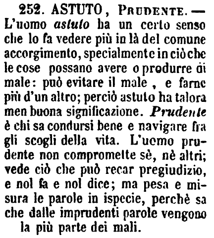 | Astuto, Prudente - L'uomo astuto ha un certo senso che lo fa vedere più in là del comune accorgimento, specialmente in ciò che le cose possano avere o produrre di male: può evitare il male, e farne più d'un altro; perciò astuto ha talora men buona significazione. Prudente è chi sa condursi bene e navigare fra gli scogli della vita. L'uomo prudente non compromette sè, nè altri; vede ciò che può recar pregiudizio, e nol fa e nol dice; ma pesa e misura le parole in ispecie, perchè sa che dalle imprudenti parole vengono la più parte dei mali. [immagine] |