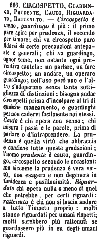| Circospetto, Guardingo, Prudente, Cauto, Riguardato, Rattenuto - Circospetto è meno, guardingo è più: il primo pare agire per prudenza, il secondo per timore; chi va circospetto pare fidarsi di certe precauzioni anteposte e generali; chi va guardingo, ognor teme, non ostante ogni preventiva cautela: un parlare, un fare circospetto; un andare, un operare guardingo; nell'uso però uno e l'altro s'adoperano senza tanta sottigliezza di distinzioni: bisogna andar circospetti prima d'incolpare altri di qualche mancamento, e guardinghi per non cadervi facilmente noi stessi. Cauto è chi opera con senno; chi misura i passi e le parole, prima di parlare o d'intraprendere. La prudenza è quella virtù che abbraccia e contiene tutte queste gradazioni; l'uomo prudente è cauto, guardingo, circospetto secondo le occasioni: ma siccome la prudenza è vera virtù, non esagera e non degenera in timidezza e pusillanimità. Riguardato chi opera nulla o meno di quel che potrebbe, per certi riguardi: rattenuto è chi non si lascia andare a tutto l'impeto proprio: molti stanno riguardati per umani rispetti; molti sarebbero più rattenuti se guardassero più in su degli umani riguardi. [immagine] |