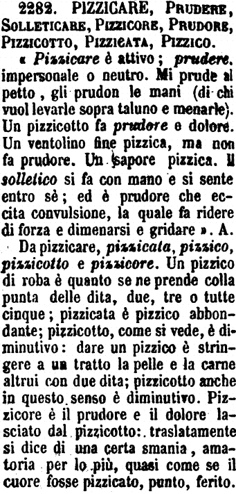 | Pizzicare, Prudere, Solleticare, Pizzicore, Prudore, Pizzicotto, Pizzicata, Pizzico - «Pizzicare è attivo; prudere, impersonale o neutro. Mi prude al petto, gli prudon le mani (di chi vuol levarle sopra taluno e menarle). Un pizzicotto fa prudere e dolore. Un ventolino fine pizzica, ma non fa prudore. Un sapore pizzica. Il solletico si fa con mano e si sente entro sè; ed è prudore che eccita convulsione, la quale fa ridere di forza e dimenarsi e gridare». A.