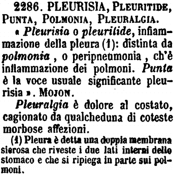 | Pleurisia, Pleuritide, Punta, Polmonia, Pleuralgia - «Pleurisia o pleuritide, infiammazione della pleura (1): distinta da polmonia, o peripneumonia, ch’è infiammazione dei polmoni. Punta è la voce usuale significante pleurisia». Mojon.