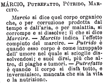 | Marcio, Putrefatto, Putrido, Marcito - Marcio si dice quel corpo organico che, o per corruzione prodotta dal tempo e dall'aria, o per malattia, si corrompe e si dissolve; il che si dice Marcire. - Marcito indica l'effetto compiuto del marcire. - Putrido è quando esso corpo è come inzuppato dell'umore nel quale si scioglie dissolvendosi; e suol dirsi, più che altro, di piaghe e tumori. - Putrefatto è quando il corpo si disfà tutto, e inverminisce, mancata che sia la vita o la nutrizione. [immagine] |