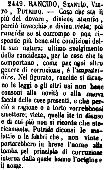 | Rancido, Stantìo, Vieto, Putrido - Cosa che sta lì più del dovere, diviene stantìa, perciò invecchia e divien vieta; poi rancida se si corrompe o non risponde più bene alle condizioni della sua natura; ultimo svolgimento della rancidezza, per le cose che la comportano, come per ogni altro genere di corruzione, è l'imputridire. Nel figurato, rancide si diranno le leggi o gli altri usi non bene consoni alla novità o alla nuova faccia delle cose presenti, e che perciò a ragione o a torto vorrebbonsi smettere; viete, quelle ite in disuso e di cui più non si ricorda che storicamente. Putride diconsi le malattie o le febbri che, non vinte, porterebbero in breve l'uomo alla tomba pel principio di corruzione interna dalla quale hanno l'origine e il nome. [immagine] |