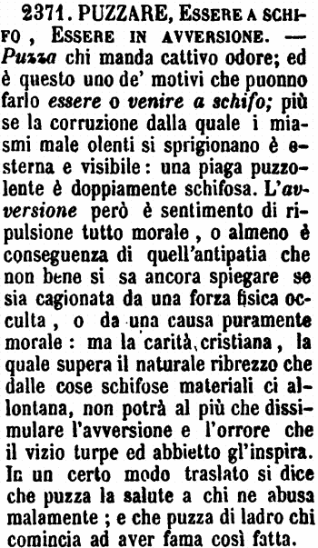 | Puzzare, Essere a schifo, Essere in avversione - Puzza chi manda cattivo odore; ed è questo uno de' motivi che puonno farlo essere o venire a schifo; più se la corruzione dalla quale i miasmi male olenti si sprigionano è esterna e visibile: una piaga puzzolente è doppiamente schifosa. L'avversione però è sentimento di ripulsione tutto morale, o almeno è conseguenza di quell'antipatia che non bene si sa ancora spiegare se sia cagionata da una forza fisica occulta, o da una causa puramente morale: ma la carità cristiana, la quale supera il naturale ribrezzo che dalle cose schifose materiali ci allontana, non potrà al più che dissimulare l'avversione e l'orrore che il vizio turpe ed abbietto gl'inspira. In un certo modo traslato si dice che puzza la salute a chi ne abusa malamente; e che puzza di ladro chi comincia ad aver fama così fatta. [immagine] |