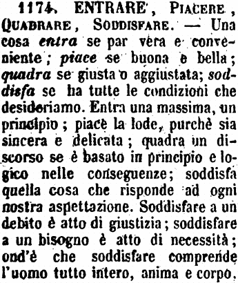 | Entrare, Piacere, Quadrare, Soddisfare - Una cosa entra se par vera e conveniente; piace se buona e bella; quadra se giusta o aggiustata; soddisfa se ha tutte le condizioni che desideriamo. Entra una massima, un principio; piace la lode, purchè sia sincera e delicata; quadra un discorso se è basato in principio e logico nelle conseguenze; soddisfa quella cosa che risponde ad ogni nostra aspettazione. Soddisfare a un debito è atto di giustizia; soddisfare a un bisogno è atto di necessità; ond'è che soddisfare comprende l'uomo tutto intero, anima e corpo. [immagine] |