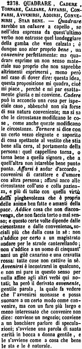 | Quadrare, Cadere, Tornare, Calzare, Affarsi, Confarsi, Avvenirsi, Addirsi, Convenirsi, Star bene - Quadrare sarebbe un calzare a capello, se nell'idea espressa da quest'ultimo verbo non entrasse quel tondeggiare della gamba che vien calzata; è dunque uno star proprio bene, un convenire perfettamente: ma quadrare esprime un non senso materiale suo proprio che non saprebbe altrimenti esprimersi, meno però nel caso di dover dire: questa idea, questa proposizione mi quadra, cioè mi piace, perché e mi par esattamente giusta e mi conviene. Cadere può in acconcio una cosa per ispeciale caso, abbenchè non sia forse di sua natura conveniente; ma si sa che le circostanze modificano le cose, come anche queste modificano le circostanze. Tornare si dice con un certo vezzo elegante e saporito di cosa spettante al vestito che stia bene alla cera, al portamento della persona: quel cappellino torna, o torna bene a quella signora, che a quell'altra non istarebbe bene punto punto. Affarsi è andar d'accordo, convenirsi di carattere e d'umore con altra persona; affarsi anco alle circostanze coll'uso e colla pazienza, e più di tutto con quella virtù della pieghevolezza che è propria delle anime ben fatte e amanti della pace. Addice cosa che non disconvenga, che non faccia torto o mal senso; e questo certe volte dipende dalle circostanze e dalle convenienze sociali più che dalla cosa in sè: non s'addice per certo a un magistrato andare per le strade canterellando; non s'addice a un uomo di cinquant'anni un gilè canarino e una cravatta rossa: tutte cose non cattive in sè. Avvenirsi è incontrarsi in qualcuno, e non mi pare in questo senso per nulla affine agli altri verbi qui notati; ha però il derivato avvenente, gentile parola, la quale fa vedere che l'avvenirsi suonasse e possa suonare a un certo modo come convenire, ma con un fare più largo e meno interessato che convenire non dice: conviene un negozio; conviene a un banchiere parlare di speculazioni; s'avviene una parola di santa carità in bocca a donna gentile, e le s'avviene come a cosa che bene le sta e le è naturale. [immagine] |