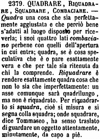 | Quadrare, Riquadrare, Squadrare, Combaciare - Quadra una cosa che sia perfettamente aggiustata e che perciò bene s'adatti al luogo disposto per riceverla; i suoi quattro lati combaciano perbene con quelli dell'apertura in cui entra; quadra, se è cosa speculativa che è o pare esattamente vera e che per tale sia ritenuta da chi la comprende. Riquadrare è rendere esattamente quadra cosa che non lo sia che imperfettamente: un asse comunque sarà quadrilungo, ma non è riquadrato. Per riquadrarlo si squadra, cioè si misura e si segna colla squadra; onde squadrare, dice Tommaseo, ha senso traslato di guardare un oggetto attentamente, minutamente, da capo a piè. [immagine] |