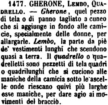 | Gherone, Lembo, Quadrello - Gherone, quel pezzo di tela o di panno tagliato a cuneo che si aggiunge in fondo alle camicie, specialmente delle donne, per allargarle. Lembo, la parte da piè de' vestimenti lunghi che scendono quasi a terra. Il quadrello o quadrelletti sono pezzetti di tela quadri o quadrilunghi che si cuciono alle maniche della camicia sotto le ascelle onde riescano quivi più larghe esse maniche, per dare agio ai movimenti del braccio. [immagine] |