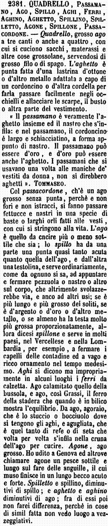 | Quadrello, Passamano, Ago, Spillo, Aghi, Ferri, Agnino, Aghetto, Spillino, Spilletto, Agone, Spillone, Passacordone - Quadrello, grosso ago a tre canti o anche a quattro, con cui si cuciono sacchi, materassi e altre cose grossolane, servendosi di grosso filo o di spago. L'aghetto è punta fatta d'una lastrina d'ottone o d'altro metallo adattata a capo di un cordoncino o d'altra cordella per farla passare facilmente negli occhielli e allacciare le scarpe, il busto o altra parte del vestimento.