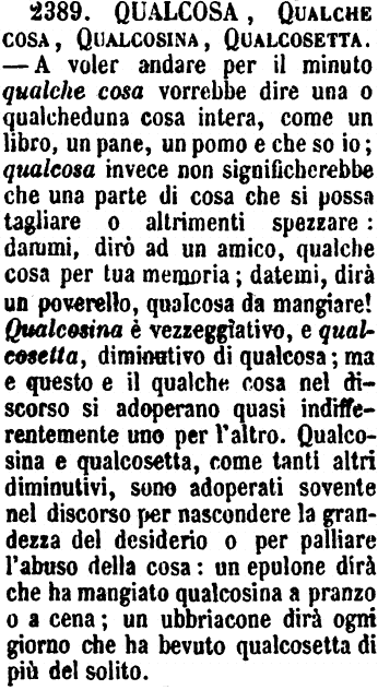 | Qualcosa, Qualche cosa, Qualcosina, Qualcosetta - A voler andare per il minuto qualche cosa vorrebbe dire una o qualcheduna cosa intera, come un libro, un pane, un pomo e che so io; qualcosa invece non significherebbe che una parte di cosa che si possa tagliare o altrimenti spezzare: dammi, dirò ad un amico, qualche cosa per tua memoria; datemi, dirà un poverello, qualcosa da mangiare! Qualcosina è vezzeggiativo, e qualcosetta, diminutivo di qualcosa; ma e questo e il qualche cosa nel discorso si adoperano quasi indifferentemente uno per l'altro. Qualcosina e qualcosetta, come tanti altri diminutivi, sono adoperati sovente nel discorso per nascondere la grandezza del desiderio o per palliare l'abuso della cosa: un epulone dirà che ha mangiato qualcosina a pranzo o a cena; un ubbriacone dirà ogni giorno che ha bevuto qualcosetta di più del solito. [immagine] |