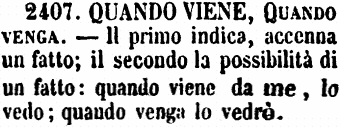 | Quando viene, Quando venga - Il primo indica, accenna un fatto; il secondo la possibilità di un fatto: quando viene da me, lo vedo; quando venga lo vedrò. [immagine] |