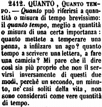 | Quanto, Quanto tempo - Quanto può riferirsi a quantità o misura di tempo brevissimo: il quanto tempo, meglio a quantità o misura di una certa importanza: quanto mettete a temperare una penna, a infilzare un ago? quanto tempo a scrivere una lettera, a fare una camicia? Mi pare che il dire così sia più proprio che non il servirsi inversamente di questi due modi, perché un secondo, un minuto, ne' casi soliti della vita, non sono considerati come vere quantità di tempo. [immagine] |