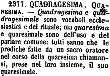 | Quadragesima, Quaresima - Quadragesima e quadragesimale sono vocaboli ecclesiastici e del rituale; ma quaresima e quaresimale sono dell'uso e del parlare comune: tutti sanno che le prediche fatte da un sacro oratore nel corso della quaresima chiamansi, prese nel loro insieme, il suo quaresimale. [immagine] |