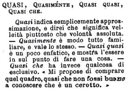 | Quasi, Quasimente, Quasi quasi, Quasi che - Quasi indica semplicemente approssimazione, e direi che significa velleità piuttosto che volontà assoluta. - Quasimente è modo tutto familiare, e vale lo stesso. - Quasi quasi è un poco enfatico, e mostra l'essere in sul punto di fare una cosa. - Quasi che ha invece qualcosa di esclusivo. «Mi propose di comprare quel quadro, quasi che non fossi buono a conoscere che è un cerotto.» [immagine] |