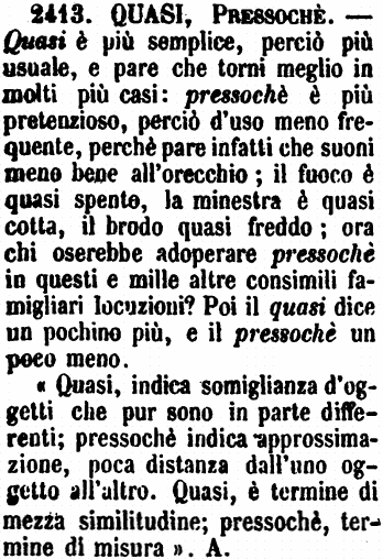 | Quasi, Pressochè - Quasi è più semplice, perciò più usuale, e pare che torni meglio in molti più casi: pressochè è più pretenzioso, perciò d'uso meno frequente, perchè pare infatti che suoni meno bene all'orecchio; il fuoco è quasi spento, la minestra è quasi cotta, il brodo quasi freddo; ora chi oserebbe adoperare pressochè in questi e mille altre consimili famigliari locuzioni? Poi il quasi dice un pochino più, e il pressochè un poco meno.