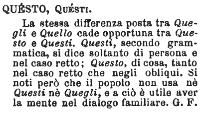 | Questo, Questi - La stessa differenza posta tra Quegli e Quello cade opportuna tra Questo e Questi. Questi, secondo grammatica, si dice soltanto di persona e nel caso retto; Questo, di cosa, tanto nel caso retto che negli obliqui. Si noti però che il popolo non usa nè Questi nè Quegli, e a ciò è utile aver la mente nel dialogo familiare. G.F. [immagine] |