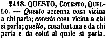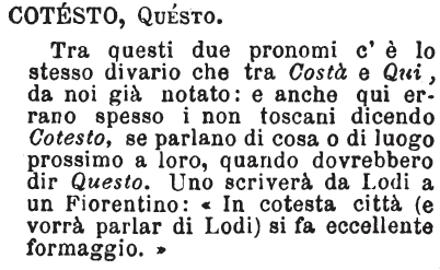| Cotesto, Questo - Tra questi due pronomi c'è lo stesso divario che tra Costà e Qui, da noi già notato: e anche qui errano spesso i non toscani dicendo Cotesto, se parlano di cosa o di luogo prossimo a loro, quando dovrebbero dir Questo. Uno scriverà da Lodi a un Fiorentino: «In cotesta città (e vorrà parlar di Lodi) si fa eccellente formaggio.» [immagine] |