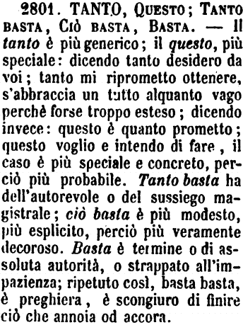 | Tanto, Questo; Tanto basta, Ciò basta, Basta - Il tanto è più generico; il questo, più speciale: dicendo tanto desidero da voi; tanto mi riprometto ottenere, s'abbraccia un tutto alquanto vago perchè forse troppo esteso; dicendo invece: questo è quanto prometto; questo voglio e intendo di fare, il caso è più speciale e concreto, perciò più probabile. Tanto basta ha dell'autorevole o del sussiego magistrale; ciò basta è più modesto, più esplicito, perciò più veramente decoroso. Basta è termine o di assoluta autorità, o strappato all'impazienza; ripetuto così, basta basta, è preghiera, è scongiuro di finire ciò che annoia od accora. [immagine] |