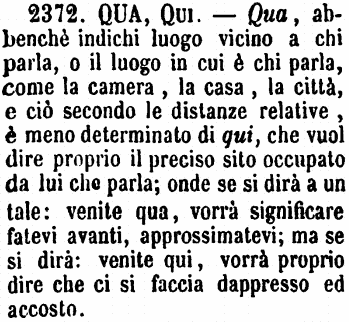 | Qua, Qui - Qua, abbenchè indichi luogo vicino a chi parla, o il luogo in cui è chi parla, come la camera, la casa, la città, e ciò secondo le distanze relative, è meno determinato di qui, che vuol dire proprio il preciso sito occupato da lui che parla; onde se si dirà a un tale: venite qua, vorrà significare fatevi avanti, approssimatevi; ma se si dirà: venite qui, vorrà proprio dire che ci si faccia dappresso ed accosto. [immagine] |