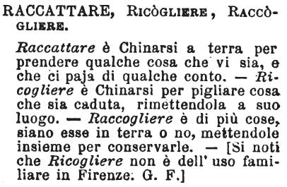 | Raccattare, Ricogliere, Raccogliere - Raccattare è Chinarsi a terra per prendere qualche cosa che vi sia, e che ci paja di qualche conto. - Ricogliere è Chinarsi per pigliare cosa che sia caduta, rimettendola a suo luogo. - Raccogliere è di più cose, siano esse in terra o no, mettendole insieme per conservarle. - [Si noti che Ricogliere non è dell'uso familiare in Firenze. G. F.] [immagine] |