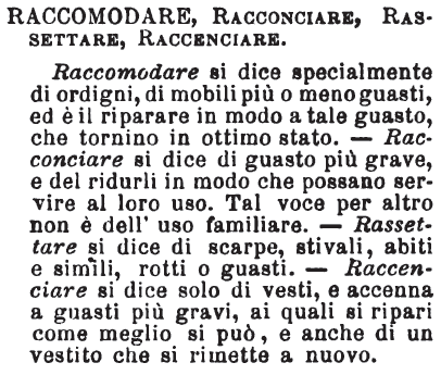| Raccomandare, Racconciare, Rassettare, Raccenciare - Raccomodare si dice specialmente di ordigni, di mobili più o meno guasti, ed è il riparare in modo a tale guasto, che tornino in ottimo stato. - Racconciare si dice di guasto più grave, e del ridurli in modo che possano servire al loro uso. Tal voce per altro non è dell'uso familiare. - Rassettare si dice di scarpe, stivali, abiti e simili, rotti o guasti. - Raccenciare si dice solo di vesti, e accenna a guasti più gravi, ai quali si ripari come meglio si può, e anche di un vestito che si rimette a nuovo. [immagine] |