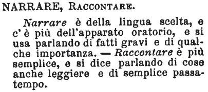 | Narrare, Raccontare - Narrare è della lingua scelta, e c'è più dell'apparato oratorio, e si usa parlando di fatti gravi e di qualche importanza. - Raccontare è più semplice, e si dice di cose anche leggiere e di semplice passatempo. [immagine] |