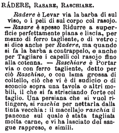 | Radere, Rasare, Raschiare - Radere è Levar via la barba di sul viso, o i peli di sul corpo col rasojo. - Rasare è spesso Ridurre a superficie perfettamente piana e liscia, per mezzo di ferro tagliente, o di vetro; si dice anche per Radere, ma quando si fa la barba a contrappelo, e anche per Tagliare i capelli col rasojo fino alla cotenna. - Raschiare è Portar via o con ferro tagliente, detto per ciò Raschino, o con lama grossa di coltello, ciò che vi è di sudicio o di sconcio sopra una tavola o altri mobili, il che si fa strisciando forte col taglio. Una persiana che si vuol ritingere, si raschia per nettarla dalla tinta vecchia: il macellajo raschia il pancone sul quale è stata tagliata molta carne, e vi ha lasciato del sangue rappreso, e simili. [immagine] |